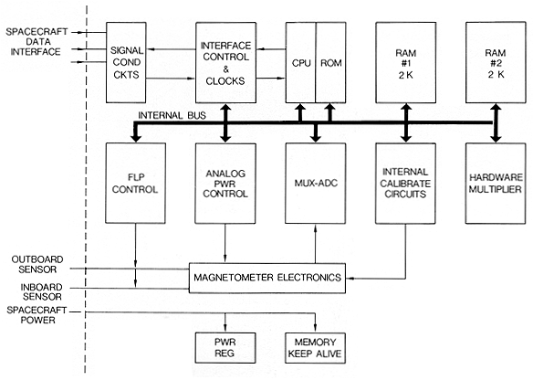 Figure 4 shows the block diagram of the system. In the block diagram those blocks residing above the internal bus, i.e., central processor (CPU), read only memory (ROM), and the random access memories (RAM), form a standard configuration microprocessor system using the 1802 family of integrated circuits. The hardware multiplier is a separate logic circuit that performs 8-bit multiplications at a high rate thus enhancing the capability of the microprocessor to process data rapidly. The flipper control, analog power control, and internal calibrate circuits are switches that are set by the micro-processor in response to ground commands. The power regulator and memory 'keep alive' circuit are power conditioning circuits that receive power from the spacecraft's alternating current power bus. The multiplexer, analog to digital converter (MUX-ADC) collects analog data under microprocessor control from the magnetometer circuits and from internal monitors of voltage and temperatures.