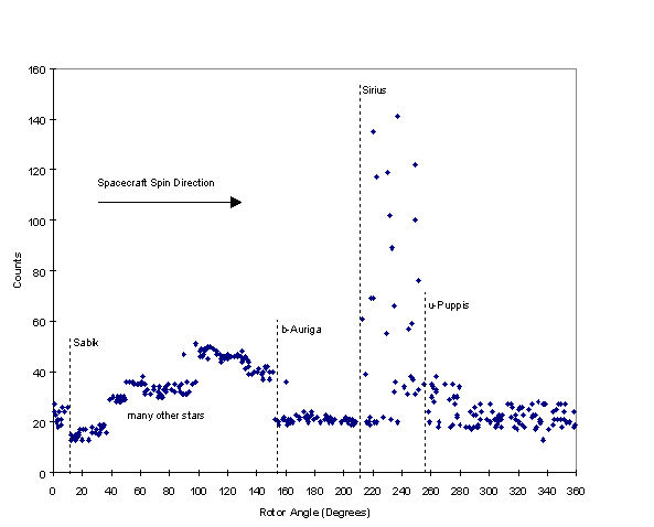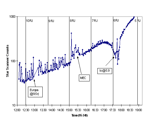 Although not directly related to the star scanner's ability to measure electrons, it is noted here that on June 19, 2000, in a period far from the Jovian radiation environment, one of the guide stars Galileo was depending upon for attitude reference "winked out" for eight hours. An exhaustive study was conducted to determine the star scanner failure that could cause this as it was deemed extremely important to not only the mission but to the work of this thesis. The author ultimately concluded that the star scanner behaved correctly and the star itself was to blame. However, this star, delta Velorum, was not listed as a variable in the GVCS, WDS or other standard star catalogs [CDS 2000]. Others have since confirmed this with other sources. Although it seemed rather far-fetched that the ~40th brightest star in the sky was a previously unknown variable star, the author contacted American Association of Variable Star Observers (AAVSO). They in turn passed the message of d. Velorum's potential variability thorough-out the amateur astronomical community until an Argentinean observer provided data on other prior eclipses - he had not reported them failing to believe such a bright star's variability could have been overlooked despite his own data. Further searching revealed an additional Galileo observation of this event on Nov 21, 1989. Due to the close proximity of Galileo to the Earth at that time, data rates were very high and a beautiful light-curve representing a 21 hour decline of 0.25 magnitude was seen. With this observation, the star was first understood to be an eclipsing binary with a period of 45.15 days. Further confirmation of the variability of d. Velorum has now come in from other observers. It is believed that the eclipse is caused by a previously unknown and spectrally similar star to the primary. The pair are separated by about 1 A.U.