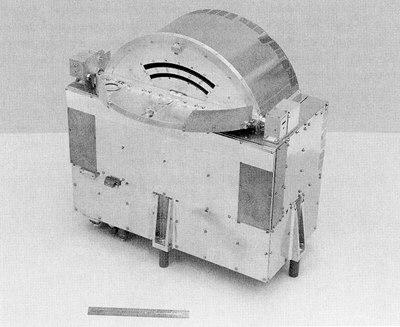 Fig. 4. Photograph of the plasma instrument. The two arc-shaped openings are the apertures for the two sets of electrostatic analyzers. A 6-inch ruler is shown for comparisons.