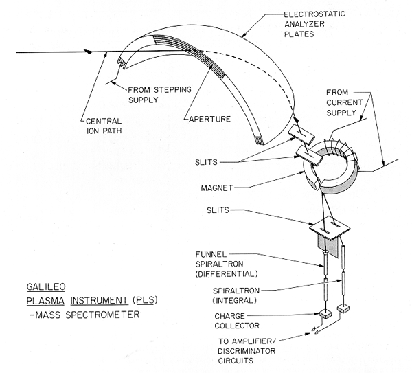 Three miniature mass spectrometers which are positioned at the exit apertures of the electrostatic analyzers in the Galileo instrument provide determinations of the positive ion composition. The Voyager determinations of ion composition from E/Q spectra are model-dependent and are possible when the Mach number of the corotational flow is greater than 5 or 6. This method is acceptable generally near the Io orbit but as the Jovian radial distance increases, ion thermal speeds rapidly increase and prevent decisive identification of ion species. The Galileo mass spectrometers provide a direct determination of ion composition, specifically the mass-per-unit charge.