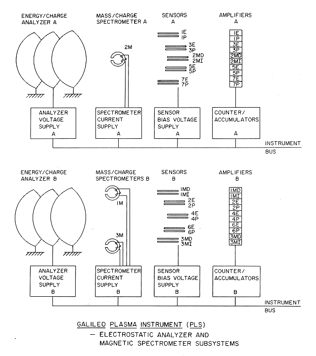 The plasma instrument is divided into two analyzer systems A and B as shown in Figure 9 (see also Figure 1). This configuration of the instrument has been chosen in order to reduce the number of possible single-point failures that could result in the total loss of the scientific objectives. Each analyzer is equipped with a set of electrostatic analyzer plates, at least one miniature mass spectrometer, and a partial set of the sensors for the measurements of the three-dimensional velocity distributions of positive ions and electrons. A dedicated plate voltage supply, magnet current supply, and sensor bias voltage supply are provided for each analyzer. Each sensor is serviced by a 16-bit accumulator. The electronics for both analyzers are controlled from the instrument bus.