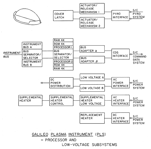 Two low-voltage power supplies, A and B, are included within the plasma instrument. By means of a power distribution system, failure of a single low voltage supply does not result in the loss of the DHCS or instrument bus. Analyzer A or B becomes inoperable with the failure of the one of the low-voltage power supplies, A or B. A power switching circuit that is controlled by ground command is used to select the analyzer to be operated with the functioning low-voltage power supply. The replacement and supplemental heaters shown in Figure 10 are used for thermal control during the mission. The latch for releasing the protective cover over the instrument aperture is a one-shot redundant device with two electrically fired, black powder Unidynamics bellows actuators.
