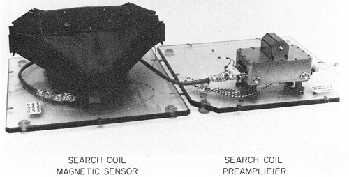 The search coil magnetic antenna consists of two high permeability rods, 25.5 and 27.5 cm long, one optimized for low frequencies, 5 Hz to 3.5 kHz, and the other optimized for high frequencies, 1 to 50 kHz. The winding on the low frequency search coil consists of 50000 turns of 0.07 mm diameter copper wire and the winding on the high-frequency search coil consists of 2000 turns of 0.14 mm diameter copper wire. The two search coils are mounted orthogonally to minimize the electrical coupling between the sensors. Both search coils are mounted perpendicular to the spacecraft spin axis. The high-frequency sensor is oriented perpendicular to the electric dipole antenna and the low-frequency sensor is oriented parallel to the electric dipole antenna. Two preamplifiers are mounted in a housing near the search coils in order to provide low impedance signals to the main electronics package. Photographs of the search coil and pre-amplifier assemblies are shown in Figure 3.
