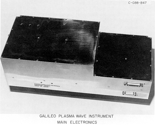 The plasma wave sensors on Galileo consist of one 6.6 m tip-to-tip electric dipole antenna and two search coil magnetic antennas. The electric dipole antenna is mounted at the end of the magnetometer boom approximately 10.6 m from the spacecraft, as shown in Figure 1, and the search coil magnetic antennas are mounted on the high gain antenna feed. The electric antenna consists of two graphite epoxy elements with a root diameter of 2.0 cm, tapering to a diameter of 0.3 cm at the tip. To minimize electric field asymmetries induced by the spacecraft structure the dipole elements are mounted perpendicular to the magnetometer boom. The antenna axis is also oriented perpendicular to the spacecraft spin axis in order to permit direction finding. Each element is hinged 1.8 m from the tip so that the antenna can be folded for launch. A housing at the base of the dipole elements contains two pre-amplifiers. These pre-amplifiers provide low impedance signals to the main electronics package, one for each element. Each element is grounded to the spacecraft structure through a 250 mega-ohm resistance to limit differential charging effects. A photograph of the electric antenna assembly is shown in Figure 2.