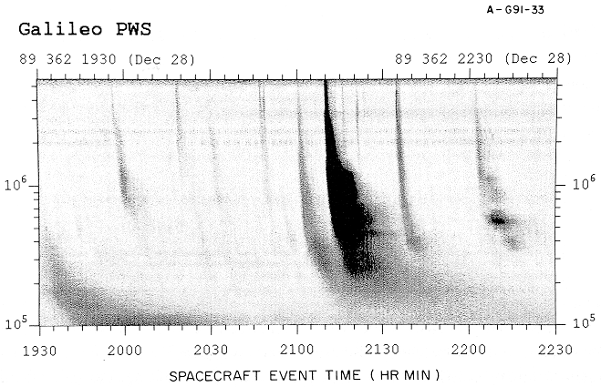 The Galileo spacecraft was successfully launched on October 18, 1989. The plasma wave instrument was turned on shortly after launch and operated satisfactorily. During a period known as the '4-day checkout', which occurred from December 27 to 31, 1989, a detailed checkout of the instrument was performed, including tests to determine if any interference was present from other spacecraft systems or instruments. The instrument operation proved to be nominal in all respects. The electric field interference levels also proved to be very low. Only a few very minor interference lines could be detected, mostly in the high-frequency receiver channels. Many type III solar radio burst were detected during the 4-day checkout, which demonstrates the excellent sensitivity of the instrument. A frequency-time spectrogram showing some of these radio bursts is shown in Figure 11. A persistent elevation of the electric field noise levels above the pre-launch noise levels exists in the low-frequency channels, below about 100 Hz. This noise is essentially structureless, and appears to be caused by the plasma.