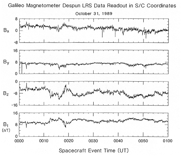 We have successfully tested this scheme for several modes of Galileo magnetometer operations. The relative angles of the sensors obtained from this scheme are within 0.1° of the angles obtained from the laboratory calibrations. The optimization program itself is very simple and less than 10 min of computer time is required on a Microvax work station to obtain all 8 parameters from 5 hours of input data. To illustrate the quality of the output despun data, we show the application of the method to a data set obtained from Galileo about two weeks after the launch when the spacecraft was in the solar wind. Figure A2.1 shows the despun data with the best matrix and offsets obtained from the optimization scheme described above. The spin ripple in all three components is below the ambient background noise in the data. This accuracy was achieved when only a few days of magnetic data with spacecraft attitude information were available to determine the matrix elements and the offsets. Further improvements in the parameters can be anticipated when quieter intervals become available for examination.