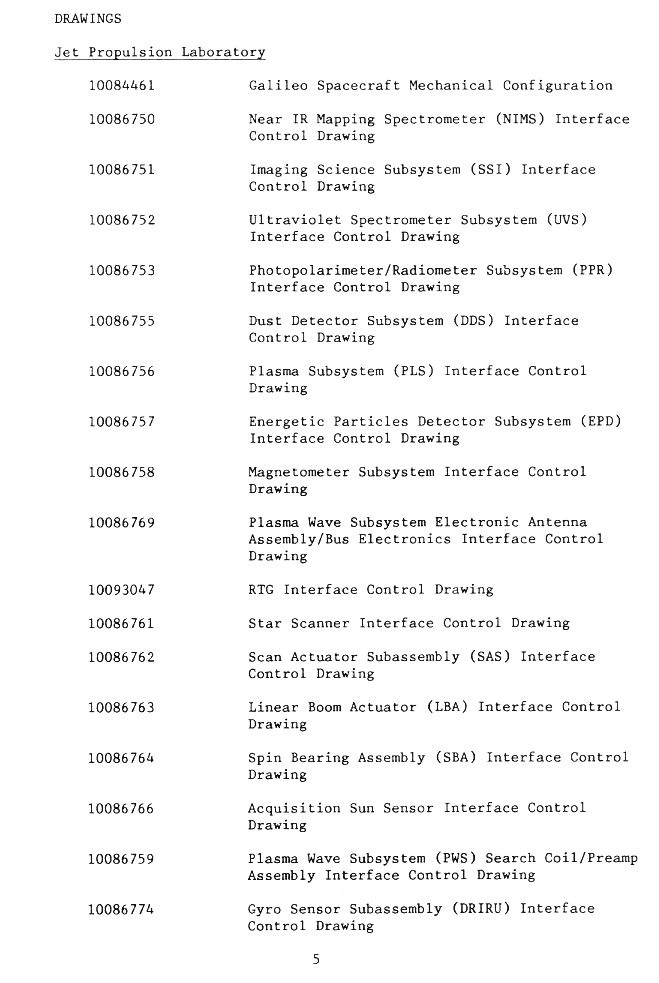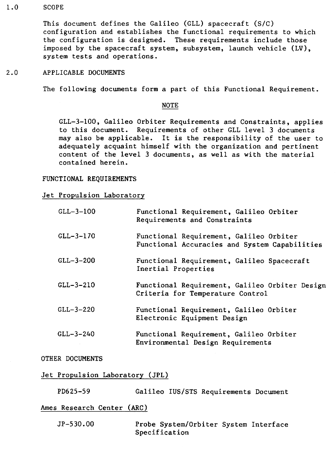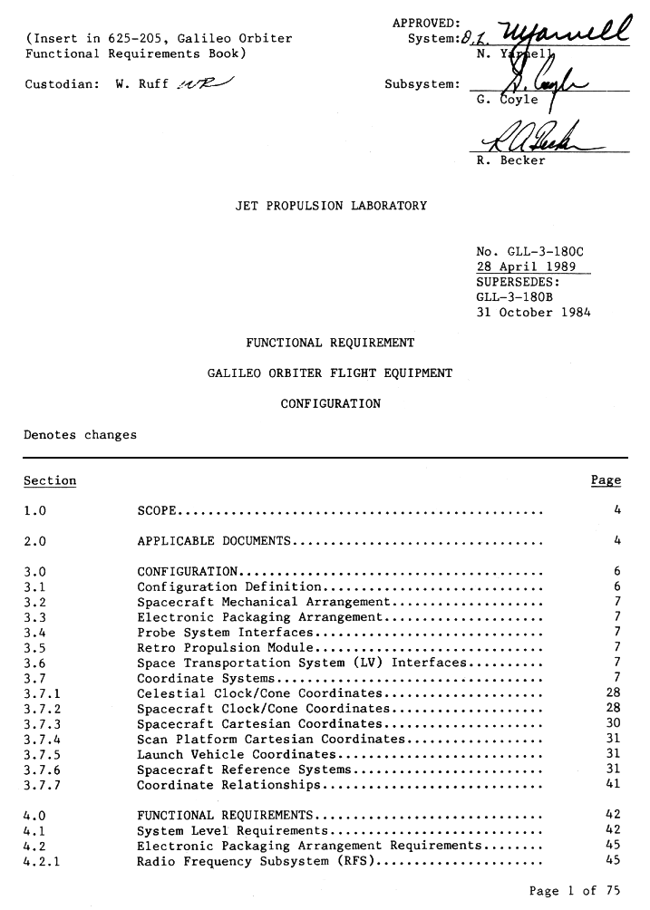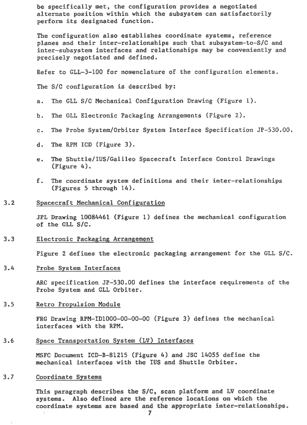 | page 7 | Config. Def. Cont, Spacecraft Mech. Config., Electronic Packaging, Probe System Interfaces, Retro Propulsion Module, Space Transportation System (LV), Coordinate Systems. | |