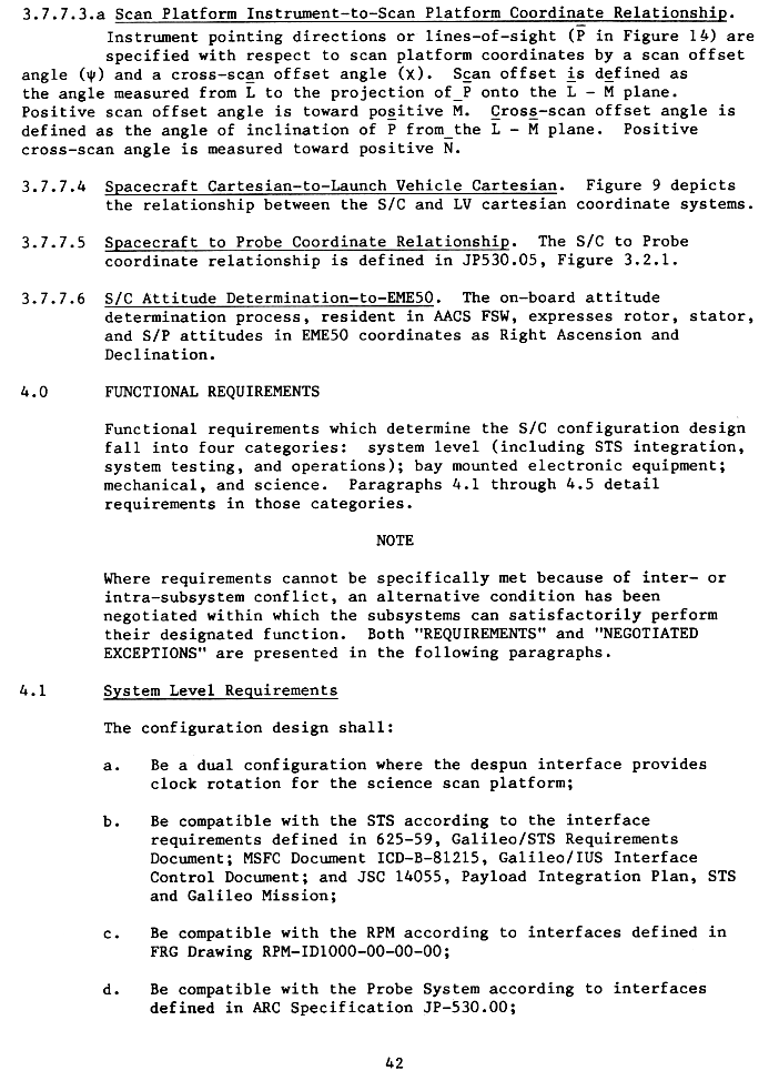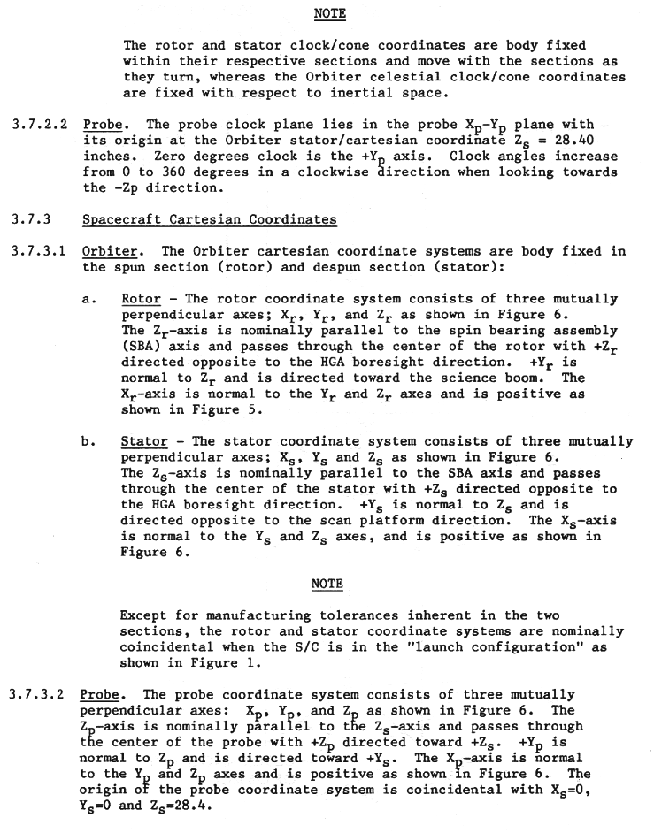 | page 41 | Coordinate Relationships S/C Cartesian to Reference Systems: Orbiter Clock/Cone to Spacecraft Cartesian: Orbiter, Probe Scan Platform to Stator Coordinate Relationship |