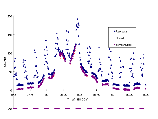 The second example uses the same situation but occurs earlier in the orbit when the compensated background count was only 100.