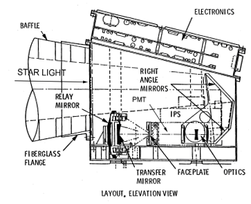 Star light exits the slits, reflects off three more mirrors and is finally detected by a single photomultiplier tube. The folded optical path was specifically designed to prevent high energy particles from coming down the instrument's boresight and striking the glass optics or the photomultiplier tube (PMT).