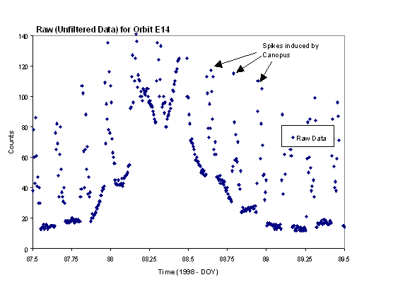 Although not directly related to the star scanner's ability to measure electrons, it is noted here that on June 19, 2000, in a period far from the Jovian radiation environment, one of the guide stars Galileo was depending upon for attitude reference "winked out" for eight hours. An exhaustive study was conducted to determine the star scanner failure that could cause this as it was deemed extremely important to not only the mission but to the work of this thesis. The author ultimately concluded that the star scanner behaved correctly and the star itself was to blame. However, this star, delta Velorum, was not listed as a variable in the GVCS, WDS or other standard star catalogs [CDS 2000]. Others have since confirmed this with other sources. Although it seemed rather far-fetched that the ~40th brightest star in the sky was a previously unknown variable star, the author contacted American Association of Variable Star Observers (AAVSO). They in turn passed the message of d. Velorum's potential variability thorough-out the amateur astronomical community until an Argentinean observer provided data on other prior eclipses - he had not reported them failing to believe such a bright star's variability could have been overlooked despite his own data. Further searching revealed an additional Galileo observation of this event on Nov 21, 1989. Due to the close proximity of Galileo to the Earth at that time, data rates were very high and a beautiful light-curve representing a 21 hour decline of 0.25 magnitude was seen. With this observation, the star was first understood to be an eclipsing binary with a period of 45.15 days. Further confirmation of the variability of d. Velorum has now come in from other observers. It is believed that the eclipse is caused by a previously unknown and spectrally similar star to the primary. The pair are separated by about 1 A.U.