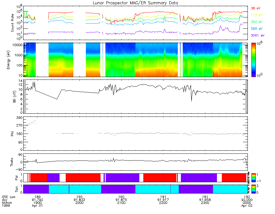 Each browse file contains plots of the following items for a 12-hour period: electron count rate (at various energies); electron energy spectrum; magnetic field, as magnitude |B| and direction (phi, theta); polarity; and Sun sensor data. The data are plotted against two time scales (decimal day-of-year and hour-minute) and a scale of GSE longitude.