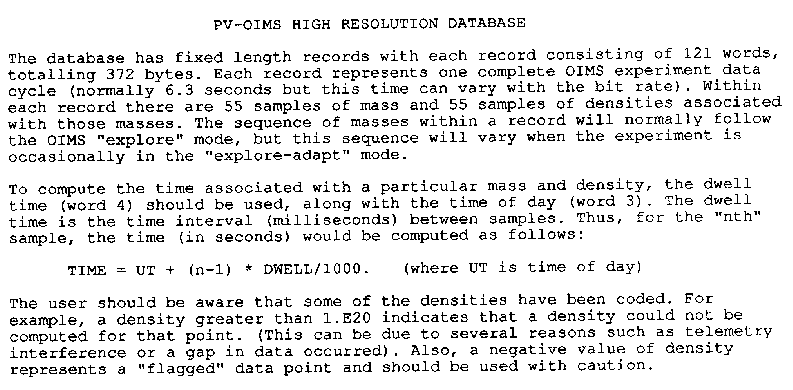 | This document describes the low resolution data products for the Orbiter Ion Mass Spectrometer (OIMS) that were provided by the principal investigators to the National Space Science Data Center. The document does not reflect exactly the current structure of the dataset. | |