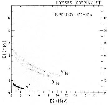 FIGURE 11. Flight data from the COSPIN LET. Shown is the D1 vs. D2 pulse height matrix for the 3He-rich period 7 - 10 November, 1990.