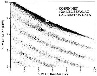 FIGURE 20. dE/dX vs. E matrix from the HET obtained for sub-iron nuclei during an accelerator calibration at the Lawrence Berkeley Laboratory Bevalac.