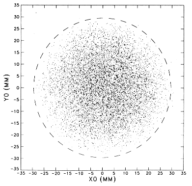 FIGURE 21. Location of particle trajectories at a plane midway between the detectors D3 and D4 computed from position measurements by detectors D1-D6 for particles with calculated charge, Z, greater than 1.5. 118 days of post-launch data are included in this figure. The dashed circle indicates the boundary of the region allowed by geometry of the telescope for particles passing through D3 and D4.
