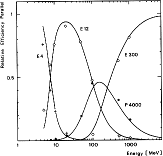 FIGURE 29. Relative efficiencies of the electron sensitive channels E4, E12, E300, and P4000, for an axially incident electron beam. The full lines are fits to the accelerator measurements; the symbols are simulation results (cross: E4, open diamond: E12, open circle: E300, full circle: P4000).