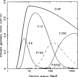 FIGURE 30. Effective geometry factors of each electron sensitive channel as a function of the electron energy, for an isotropic flux. Full thin lines from left to right: effective geometry factor for E4, E12, and E300. Dashed lines: effective geometry factor for electron induced P190 (lowest) and P4000 (highest). Full thick line: sum.