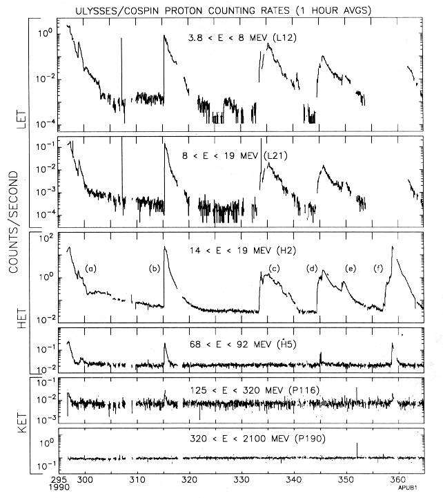 Although the experiment data records (EDRs) were not available at the time of preparing this report, sufficient "quick look" data have been available to obtain significant results for the first approximately 70 days of the mission. The Sun was extremely cooperative in producing a series of six solar flares (labelled a-f in Fig. 5) which accelerated protons, heavier nuclei and electrons. Figure 5 illustrates measurements of one hour averages of counts per second for protons over a wide range of energy intervals for the six (6) solar flare events in this period. Figure 6 is the corresponding set of electron measurements during the same period.
