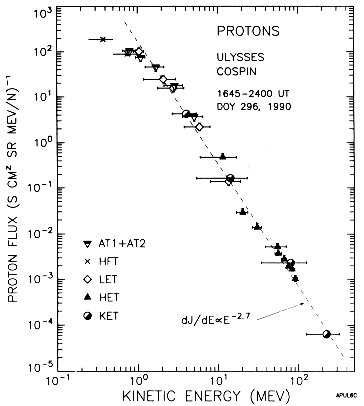 Figure 7 is the proton differential energy spectrum of the solar flare event in progress at the time COSPIN power was first turned on at 1643 UT on Day 296 (23 October), 1990. The spectrum covers an energy range extending from 0.5 MeV to 200 MeV and a dynamic flux range of seven (7) orders of magnitude. The spectrum in Figure 7 is a power law, E-2.7, above ~ 2 MeV but it flattens at lower energies. This spectrum is a composite of measurements from all 6 independent COSPIN charged particle telescopes, each calibrated in particle beams independently before launch and each possessing different geometrical factors. The measurements in Figure 7 have provided the first direct test of the intercalibration of these telescopes. It is clear that these independent determinations of geometrical factor, efficiencies of detection, energy thresholds, etc., for the COSPIN instruments are remarkably consistent.
