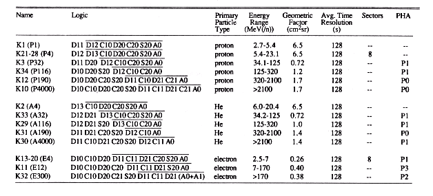 The data produced by KET consist of pulse height analysis data and coincidence counting rates corresponding to broad energy ranges for incident particles. The ranges and time resolutions for the counting rates are shown in Table 10. Pulse height analysis is performed on a sample of the incident particle events to provide good energy resolution (between 60 and 100 % for electrons) and clear identification of particle species. Single-detector counting rates and housekeeping data are also telemetered to monitor instrument performance.