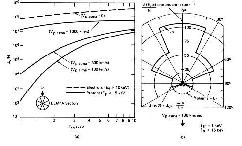 In addition to the above measurements, the low energy (~15 keV) proton threshold on the LEMPA allows direct measurement of moving hot plasmas of sufficiently high density. We have reported plasma flow and temperature measurements in the Earth's magnetotail, magnetosheath and upstream bow shock region (Roelof et al., 1976) using a detector with somewhat higher energy threshold (50 keV) and a geometric factor of only ~ ¼ that of the LEMPA. Our technique deduces both the plasma bulk velocity and temperature from the anisotropy of the sectored fluxes. The sensitivity of the LEMPA to a moving Maxwellian plasma is illustrated in Figure 1. The peak integral flux from the direction of the plasma flow divided by the density (J0/N) is given as a function of 'thermal energy' Eth = kT in Figure 1a for ≥ 15 keV protons for three bulk flow velocities (and for ≥ 10 keV electrons, which are insensitive to plasma flow). The sample angular distribution (given in Figure 1b) for a 1 keV plasma flowing at a relatively low velocity of 100 km s-1 exhibits an anisotropy sufficiently strong to determine the proton temperature. At a moderate 300 km s-1 (typical of the terrestrial magnetosheath), a plasma of density 10-2 cm-3 would yield ~102 counts in the peak sector of the ≥ 15 keV proton LEMPA channel (while rotating at 1 RPM), allowing ~10% statistics for an anisotropy 'snapshot' every minute. In addition, Figure 1a demonstrates the high sensitivity of the ≥ 10 keV electron LEMPA channel to hot plasma (independent of bulk velocity), with rates ~102 s-1 even for densities as low as 10-6 cm-3. Thus the lowest energy LEMPA channels are capable of measuring the high energy tail of plasmas with kT ≈> 1 keV, while the higher energy channels span the physically important transition region to the nonthermal energy region (~300 keV) that often accompanies hot plasma flow as is the case in the outer terrestrial magnetosphere (Sarris et al., 1976). Measurements of such plasma flows have proved to be essential in delineating the dynamics of the Earth's magnetotail, including the substorm process and the 'plasma mantle' (Rosenbauer et al., 1975).