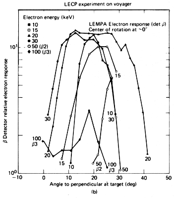 (b) Angular response of detector β in LEMPA to a undirectional beam of incident electrons; note that 10 keV electrons are readily counted by the detector.