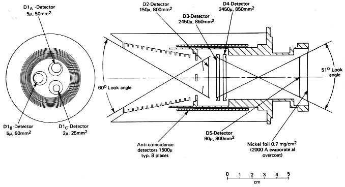 Measurements fulfilling the requirements of the comprehensive investigation objectives described in the previous sections cannot be conducted with a single charged particle sensor. To attain the lowest energy of response over a wide variety of particle species and with appropriate geometry factors and angular resolution, the LECP utilizes two distinct all solid-state detector configurations each of which is optimized for a particular energy-intensity range and/or group of particle species. This procedure has the additional important advantage of providing overall experimental redundancy. The two detector subsystems designated as (a) The Low Energy Magnetospheric Particle Analyzer (LEMPA) and (b) The Low Energy Particle Telescope (LEPT) are described in the next two subsections. A picture of the flight instrument is shown in Figure 2. Both of these detector subsystems use multi-parameter detection techniques to provide measurements in over-lapping energy and intensity ranges; this redundancy increases system reliability and reduces background. Although the individual subsystems are optimized for either the interplanetary or magnetospheric environments, both subsystems will contribute substantial measurements which are important to both environments (Figure 8). The sun-shield used for both subsystems provides an additional unique and important function in that we are able to unambiguously determine the background counting rates for all system detectors and channels in both environments. Also, small radioactive sources for inflight calibration are mounted on the sunshield. Since the detector design was done prior to the Pioneer 10 encounter of Jupiter, certain changes were necessitated following the publication of the Pioneer results. The most important of these changes was the addition of substantial shielding to appropriate detector subsystems.