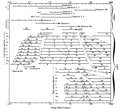 Fig. 8. Energy and species coverage diagram for the LECP experiment. Numbers in LEPT blocks indicate channel number in the instrument data system. The figure is drawn for flight unit No. 1. Energy coverage for flight unit No. 2 may differ somewhat from that shown above.