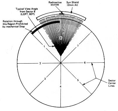 Fig. 9. Sectoring scheme for the LECP experiment detector assemblies. The sequence is 8-7-6-5-4-3-2-1-1-2-3-4-5-6-7-8-8-7-.... Radioactive calibration sources for both LEPT and LEMPA are mounted inside the sun shield.