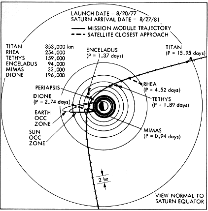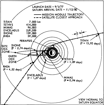 At Saturn, the flyby conditions will be unrestricted, unless the spacecraft is to continue on to Uranus, in which case the trajectory will be constrained to remain close to the ecliptic plane. Here the mission objectives of achieving an Earth and Sun occultation of the rings, and a close encounter with Titan, are the main considerations that shape the flyby trajectory. Concern that Saturn's rings may extend considerably beyond the A ring and impose a possible hazard to the spacecraft ( Michaux, 1975), as well as the possibility of a non-negligible Saturn radiation environment, motivates the choice of encountering Titan before rather than after arriving at Saturn and the rings. In addition, the trajectory is designed to include occultations of the Earth and Sun by Titan and a passage through Titan's wake.
