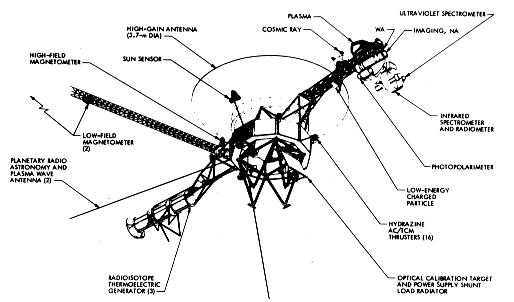 The science boom provides mounting for the science scan platform and, inboard of the platform, the Low Energy Charged Particle, Cosmic Ray, and Plasma instruments. The two-degree-of-freedom scan platform supports the Ultraviolet Spectrometer, Infrared Interferometer Spectrometer and Radiometer, Photopolarimeter, and the wide and narrow-angle cameras and control electronics of the Imaging Science Subsystem. A Brewster plate is mounted on the bus for polarimetric calibration of the Photopolarimeter, and a diffuse calibration target for scan platform instruments is positioned on the back side of the shunt radiator assembly of the power subsystem.