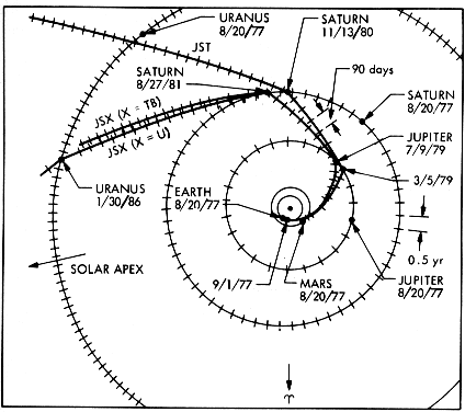 Presented with data describing the trajectory characteristics of these two sets, the SSG and the Project have chosen those candidates which became part of the overall launch strategy. This strategy identifies the trajectory which will be chosen for each launch day and, since there are two launches, the choice for the second will depend upon when the first is launched, and its success or failure. No attempt will be made here to describe the launch strategy and the trajectory choices on a day-by-day basis throughout the one-month launch opportunity. Instead, detailed descriptions will be given of the two nominal trajectories which have the highest probabilities of being flown. Thus, for the launch strategy developed, the first launch will be August 20 on a Uranus option trajectory. It has been designed JSX, where the X may be replaced by U if the Uranus option is exercised, or by T if a close Titan encounter is chosen. The second launch is planned for September 1 on an Io-intensive trajectory and is called JST, where the T stands for Titan. The JST trajectory, as discussed earlier, will arrive at Saturn first and will not have the option to go to Uranus. The Voyager I spacecraft will fly the JST trajectory, and Voyager 2 will fly the JSX trajectory.