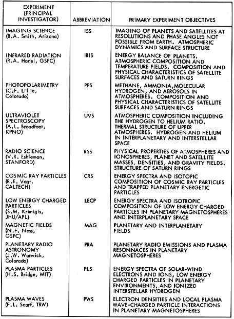 The Voyager mission objectives are to conduct exploratory investigations of the Jupiter and Saturn planetary systems and of the interplanetary medium from Earth to Saturn. Primary emphasis will be placed on comparative studies of the two systems, including their environments, atmospheres, and body characteristics. Special trajectory targeting will allow detailed investigations of one or more satellites of each planet, including Io and Titan, and of the rings of Saturn. In addition, a Uranus option possibility is being maintained on the second-arriving spacecraft at Saturn, but would only be considered if the first-arriving spacecraft had first secured the key Saturn-related science objectives and if the second-arriving spacecraft was judged to have adequate expendables and operational health to undertake the additional four years of flight from Saturn to Uranus. The large complement of scientific instruments aboard each Voyager allows the investigation of particles and fields as well as broad coverage of the electromagnetic spectrum. Table I lists the instrument teams together with their Principal Investigator and major experiment objectives. The teams themselves directly involve nearly 100 science investigators.